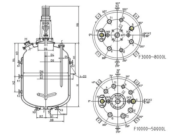 The internal design pressure can reach up to 1.0 MPa, with capacity options ranging from 3000 L to 50000 L. The jacket is designed for a maximum pressure of 0.6 MPa, and both the tank and jacket can safely operate within a temperature range of –20 °C to 200 °C.